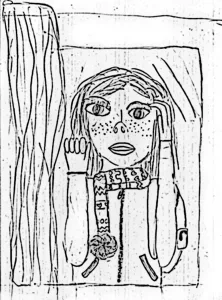 Bij d’r opa weëd óp de vinster jeklopd. Heë kiekt eroes. Ziet ’t Aimée. Het hat de heng boave de oge. Um zoeë besser eri tse kanne kieke.